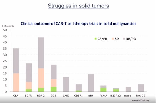 2017年以來,美國食品藥品監(jiān)督管理局接連批準(zhǔn)諾華公司的Kymriah 和 Kite 制 藥 的 Yescarta上市,使CAR-T 療法開始出現(xiàn)在大眾視野,并逐漸成為最具前景的腫瘤治療方式之一。近年 CAR-T在血液系統(tǒng)腫瘤治療,尤其是靶向CD19 CAR-T在急性難治型淋巴細(xì)胞白血病治療中,取得了矚目成就。然而,CAR-T在實(shí)體瘤的攻堅(jiān)上仍處于一個初期階段。按照雷博士的話說,為數(shù)不多的靶點(diǎn),腫瘤微環(huán)境、腫瘤異質(zhì)性、On Target Off-tumor所導(dǎo)致的副作用都是限制CAR-T療法在實(shí)體瘤領(lǐng)域發(fā)揮的重要因素。