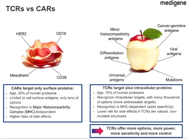 據(jù)雷博士介紹,CAR-T和TCR-T從整體的制備工藝到治療,途徑其實(shí)是一摸一樣的。包括從單采血到病毒載體/非病毒載體的改造,到后續(xù)的擴(kuò)增和回輸。其中最大的區(qū)別在于CAR-T療法所識別的靶抗原均為細(xì)胞表面蛋白,而胞外抗原僅占總抗原的10%,因此如何尋找適合的靶點(diǎn)成為困難所在。而TCR-T 療法能識別組織相容性復(fù)合(MHC)分子呈現(xiàn)的細(xì)胞內(nèi)的抗原片段,因此 TCR-T 療法具有更廣泛的靶點(diǎn)。